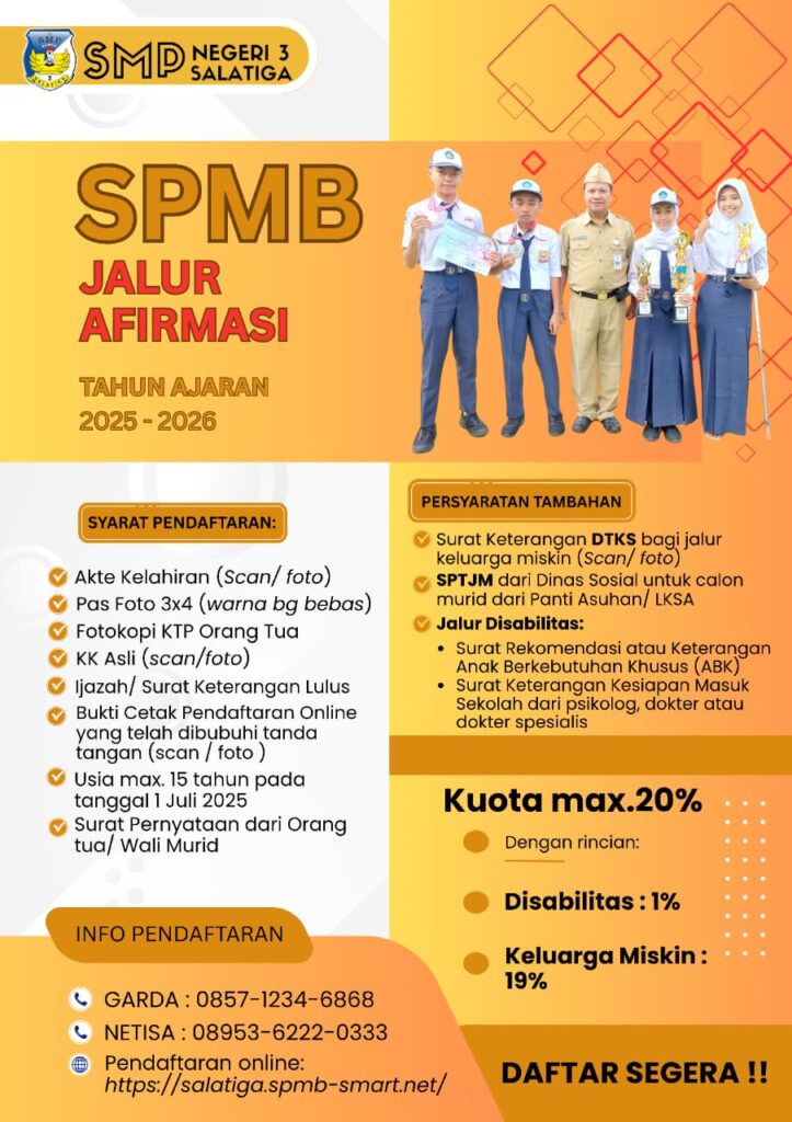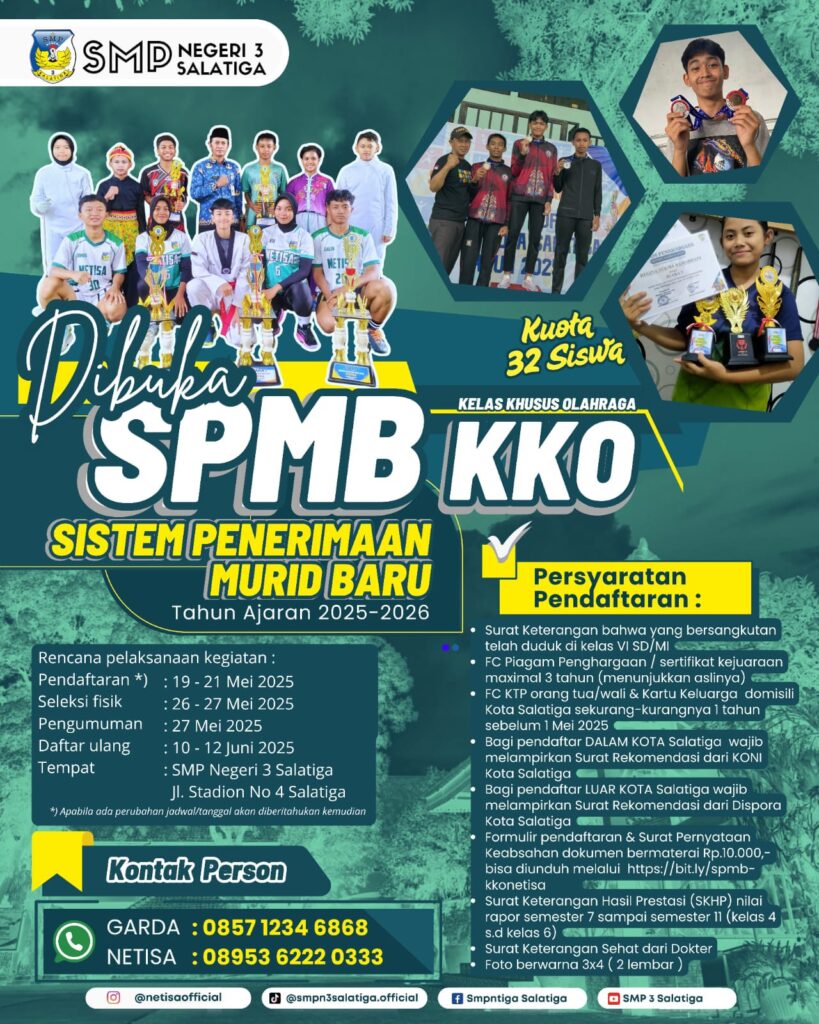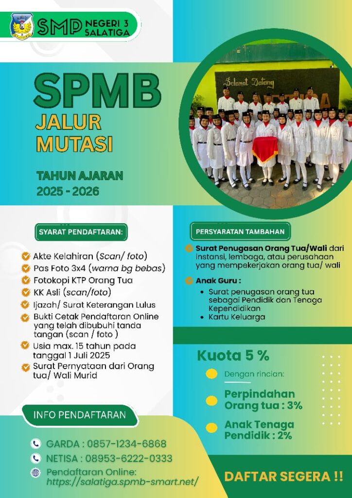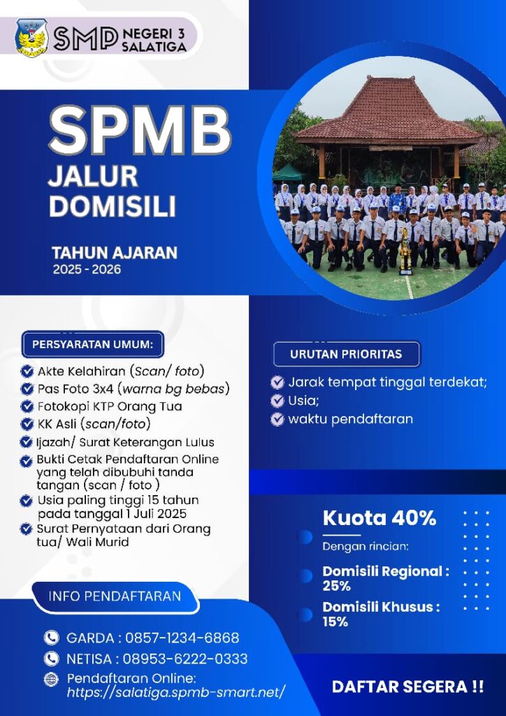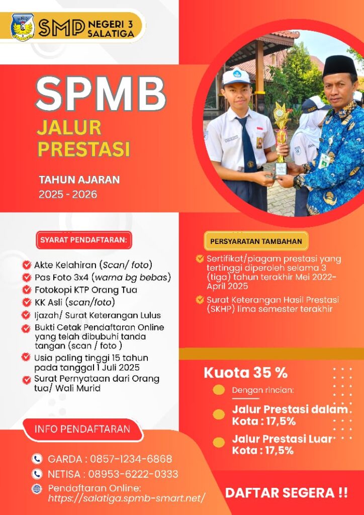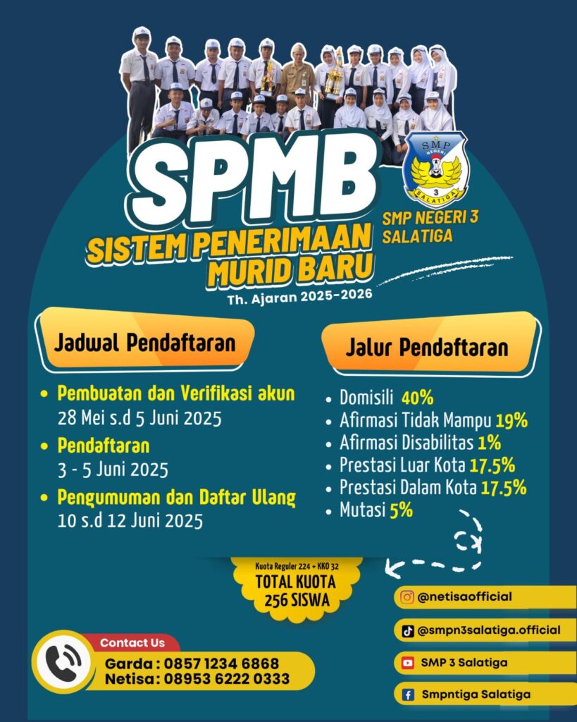 Selamat datang, para calon pemimpin masa depan! Dengan bangga, SMP Negeri 3 Salatiga kembali membuka pendaftaran bagi putra-putri terbaik bangsa untuk bergabung bersama kami di tahun ajaran 2025/2026. Kami berkomitmen untuk menyediakan lingkungan belajar yang inovatif, inspiratif, dan mendukung setiap murid untuk mencapai potensi maksimalnya.